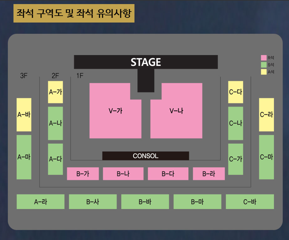 R석이 가장 비싼 만큼 공연이 매우 잘 보일 것 같습니다. V-가, V-나를 예매하는 게 가장 좋을 것 같아요. A석은 무대 끝 자리 공연 보기에 조금 불편해 보이니 이점 참고하시길 바랍니다. 예매는 한 아이디당 4장까지 구매 가능합니다.